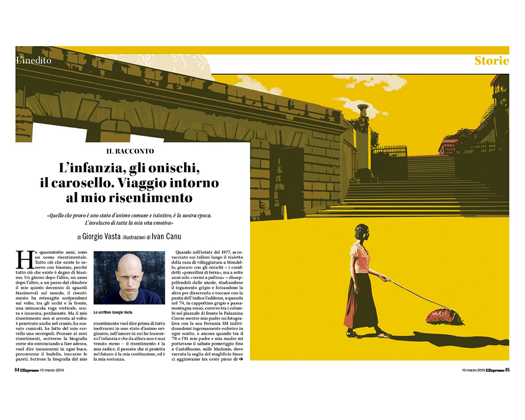 Double spread illustration for Giorgio Vasta’s Viaggio intorno al mio risentimento, for L’Espresso magazine, Mar. 2019 (AD Stefano Cipolla) Back to all projects